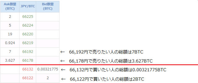 売りたい人と、買いたい人の境目である赤い線のところで取引が成立しています。上下に離れるほど待ち順位は下がります。早く買いたいという方は、売り手の中で一番安い価格である「66178」と入力しましょう。