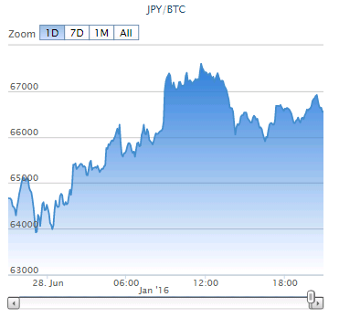 bitflyer-how-to-use02548_5チャートは、売り買いの判断基準の1つになります。これは2016年6月28日の相場で、約64,000円~67,500円の値動きがあります。チャートの上にある「ZOOM」を週単位、月単位などに切り替えて、自分なりの予想を立てていくのが良いでしょう。