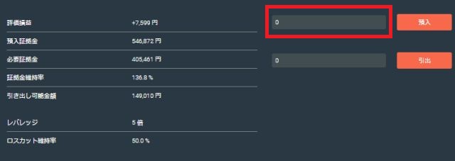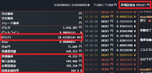 最初に入金した金額がここに表示されますが、取引を行うことでここの金額は上下します。BTC-FXでの収益は、預入証拠金の中で勘定されます。