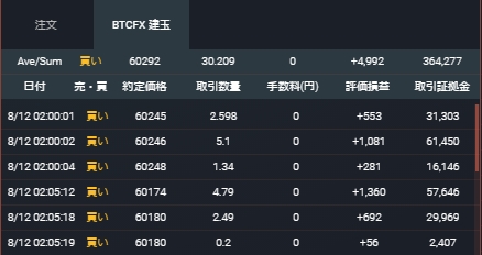 大体57,912円くらいの時に取引をしたBTC-FXということになります。