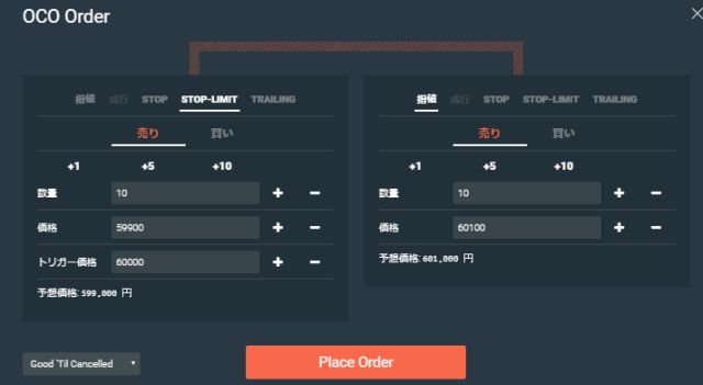 現在の価格が60050円(買値)だとしてあなたは10BTCのポジションを持っていたとします。60100円になったら売りたい(利確)、でも下がることも考慮して最終取引価格が60000円をマークしたら損切のために売りたい場合はOCOを使います。