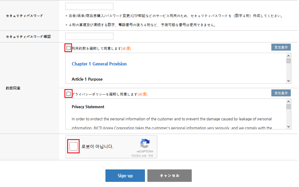 - セキュリティパスワード:出入金の際や、セキュリティに関するサービスで使用するパスワードです。ログインパスワードとは異なるものです。指定通り4桁の数字を入力し忘れないようにしてください。