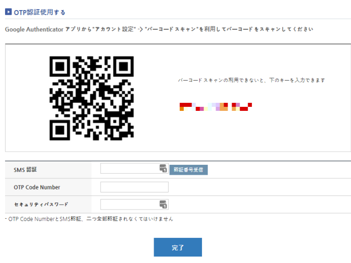 ということで、2段階認証を設定するためには「認証番号取得」をクリックして、登録した携帯電話に送られてきたSMSの数字を「SMS認証」に入力し、2段階認証アプリでQRコードを読み込み表示された数字を「OTP Code Number」に入力します、さらにアカウントを作る時に設定した4桁の数字を入力することで2段階認証が完了します。