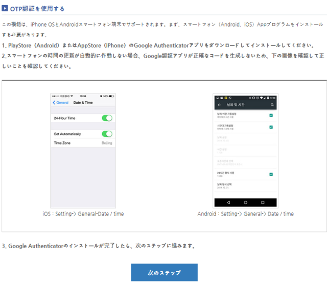 Bithumbでは登録した携帯電話番号でのSMSでの認証のほかに、アプリによる2段階認証も用意されています。