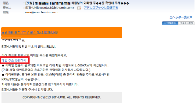クリックすると登録したメールアドレス宛に下図のようなメールが届きます。ハングル文字でメールが届きますが感でわかると思います。