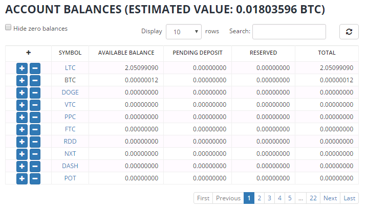 これは、現在あなたが所有している暗号通貨の種類ごとに表示されています。上記の表だと、今あなたはLTC(Lite Coin)を2.05099090LTC、BTC(Bitcoin)を0.00000012BTC持っていますよ、ということになります。(少なくてすいません)