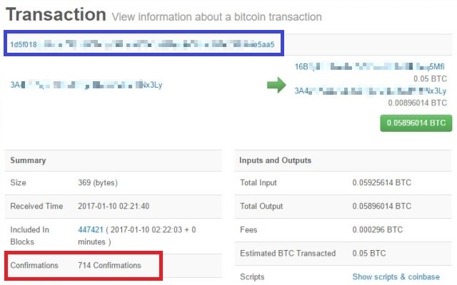 ビットコインは送金手続きをしたらすぐに相手に届くわけではありません。赤枠の「Confirmations 714Confirmations」(714回確認)というのがありますが、確認されて初めて送金をしたことになります。ウォレット間での送金・受金はすぐに届くことがありますが、取引所等に送金をした場合は、6Confirmations(6確認)されるまで待ってみましょう。