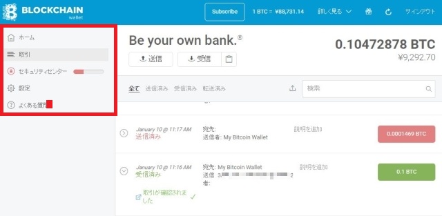 こちらの記事では、ログイン後の画面のサイドメニューにある項目について解説していきたいと思います。基本的には、ウェブウォレットと呼ばれるブロックチェーン等のサイト(ビットコインの取引所含む)にビットコインを預けるということは、他人の財布にお金を預けているような感じなので、大元がハッキングなどの被害にあえば自身が預けているビットコインも盗まれてしまう可能性があることは念頭に入れておいてください。