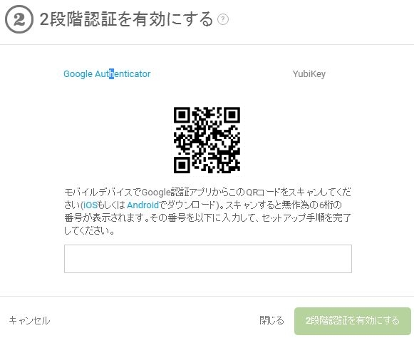 Google Authenticator(Google認証システム)とYubikeyのどちらかを選択することができます。Google Authenticatorをご利用の方はQRコードを読み込んで表示される6桁の数字を入力して「2段階認証を有効にする」をクリックしましょう。