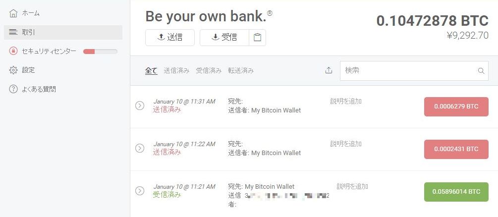 こちらでは、作成したビットコインウォレットでの送金、受信をしたビットコインの履歴を見ることができます。