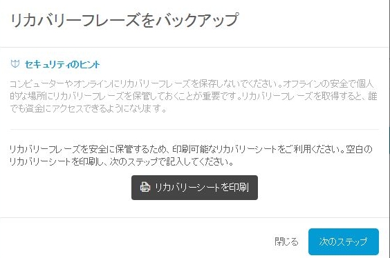 バックアップセキュリティフレーズを控えておくことによって、万が一があった場合でもあなたのウォレットを復元することができます。