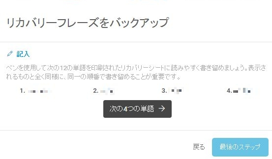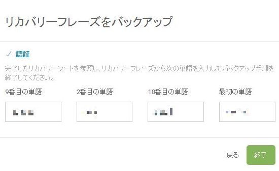 1~12の英単語をメモした後に、ちゃんとメモされているかどうかを確かめるために、ランダムに英単語を入力を求められます。入力後「終了」を入力すれば、万が一があった時でも、リカバリーフレーズを入力することで、あなたのウォレットを復元することができるようになります。