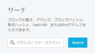 まずは上記のサイトに移動してください。移動すると下図のような検索窓があるのでそこに送金したり受金に使ったBTCウォレットのアドレスをコピペして検索します。