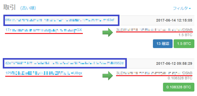 青枠の長い英数字は特定の取引につけられたコードです。Blockchainでこのコードを検索すれば一発でその取引だけを表示させることができます。