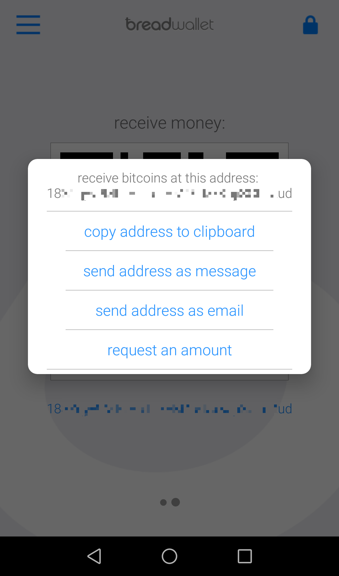 右側は、アドレスをタップするとアドレスをクリップボードにコピーしたり、メールやSMSで送ったり、請求金額を乗せたQRコードを生成することができます。