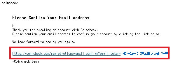 登録したメールアドレス宛にコインチェックから「Please Confirm Your Email address」という件名のメールが届いていますので、本文中にある赤枠のリンクをクリックしてメールの認証をしましょう。