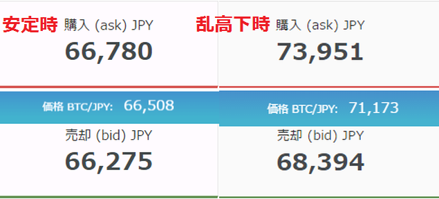 右側の5,000円以上幅がある時は、2016年6月22日のナイアガラ滝のごとく相場が落ちるちょいと前の「販売所」の価格です。下落中はもっとスゴイ価格差があったと思われます。