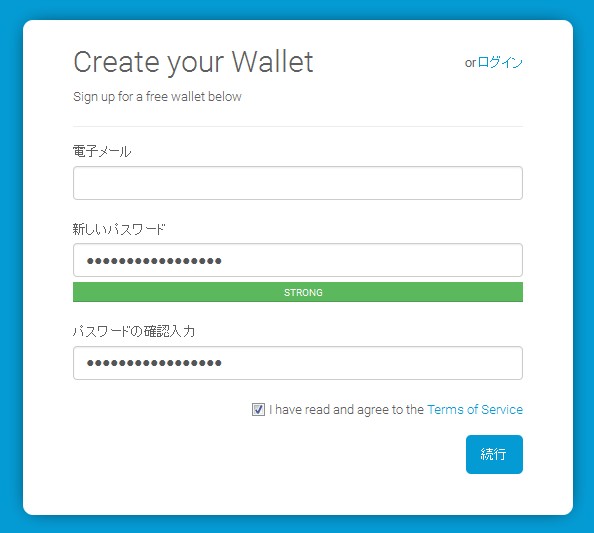 ブロックチェーン(Blockchain)のウォレットの作り方を解説していきます。こちらのサイトは日本語にも対応しているので、直感的にアカウントの登録ができます。