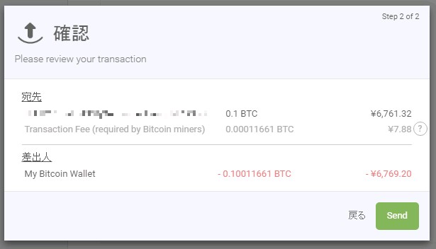 こちらで宛先、送金する額、送金手数料が確認できますので間違いがなければ「Send」をクリックして送金手続きは完了となります。