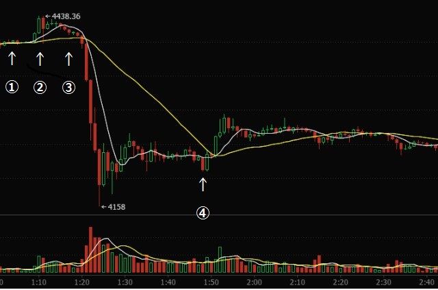 ③あたりで、勢いが無いので見切ってビットコイン売却して待ちの姿勢。その直後に、見事なナイアガラを見せて「おいおい、下げるのかよ」チャットが盛り上がりを見せる。そして、自分を褒め称えるw