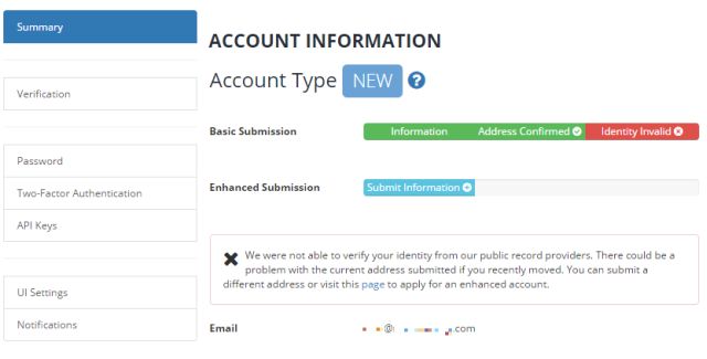 左側の「Summary」のタブで名前、誕生日、アドレスを入力して承認されれば「Account Type」が「Basic」になります。(上図では「NEW」)