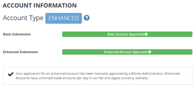 問題がなければ、Account typeが「Enhanced」になり制限なく取引をすることができるようになります。