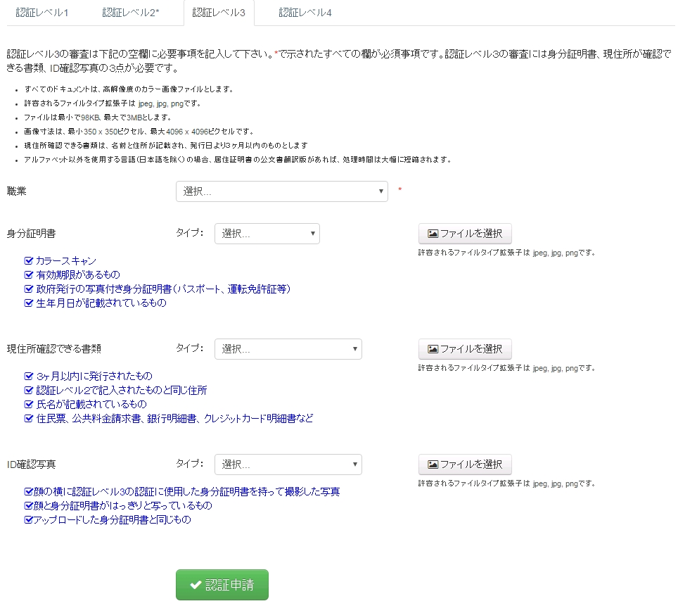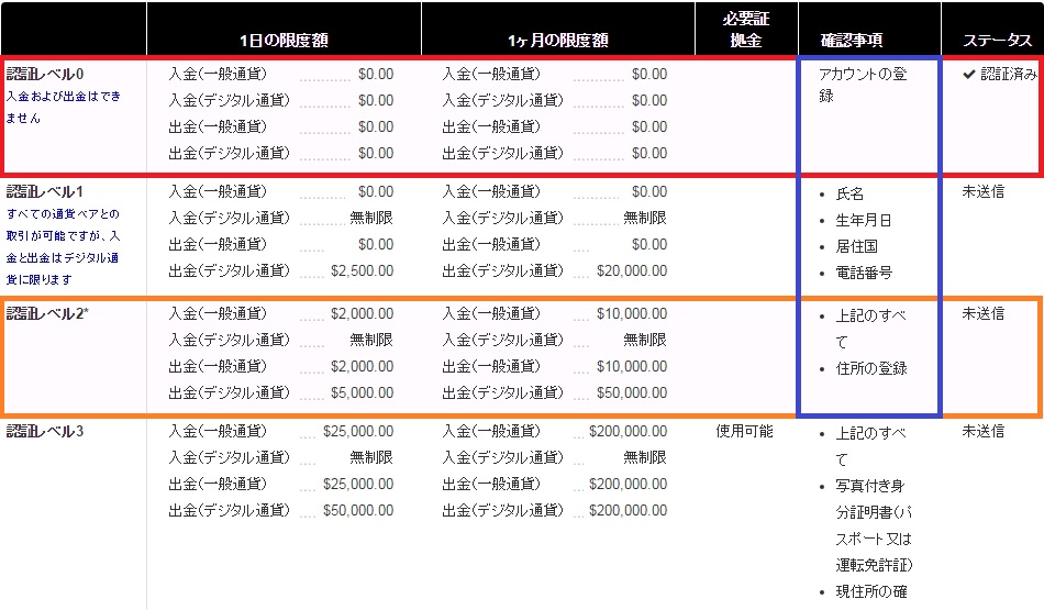 アカウント登録だけが澄んだ状態だと「認証レベル0」です。円やドルなどの一般通貨、デジタル通貨(暗号通貨・仮想通貨)の出入金ができないので何もできません。承認レベルを上げるには下図の青枠部分の情報が必要になります。