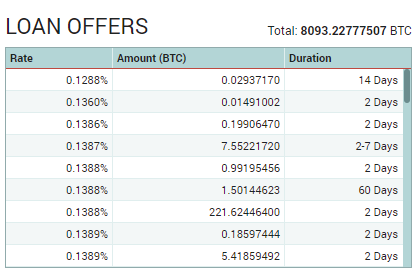 上図ではBTCのレートが0.1288%~となっていますが、他のアルトコインが高騰した時などは借りたい人がたくさんいるため、金利が高くなることがあります。2%以上になることは稀かもしれませんが、Lendingをチェックして一番安い貸しての金利が2%以上の場合はこれを適宜変更する必要があります。