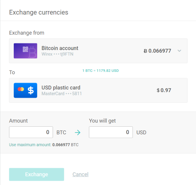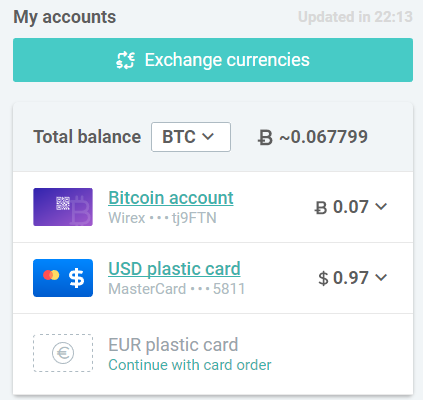 まずは、チャージするためのビットコインをWirexのウォレットに送金しておく必要があります。Home画面左にある「Exchange currencies」をクリックします。送金の仕方を忘れた方は下記の記事をご参照ください。