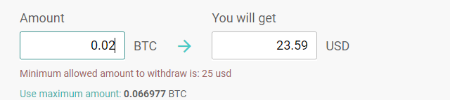 一回の入金につき最低$25と決まっているので、それ以上になるようなBTCを入力するようにしましょう。
