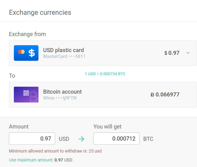 交換時点でのレートは「Bitcoin account」と「USD plastic card]の間に表示されています。