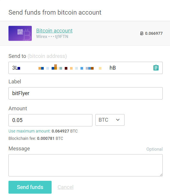 後は、送金したい額をAmountに入力して「Send funds」をクリックすれば送金完了となります。ウォレット間での送受金ではないので時間がかかると思ってください。