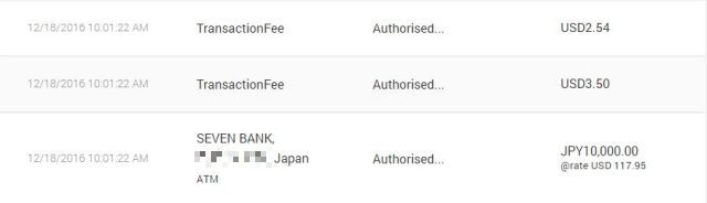 引き出し後、利用履歴を見てみると$3.5(ATM利用手数料)、$2.54(Wirex利用手数料)が引かれています。データとして反映されるのは4~5時間といったところでしょうか。