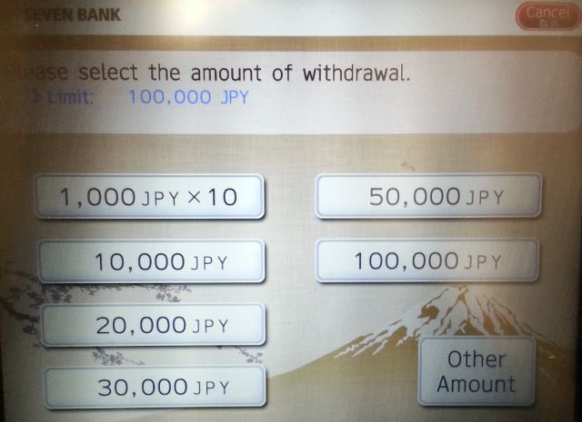 入力後、引き下ろしたい金額が表示されるので制限等は見ればわかると思います。意外と1000円札10枚コースがあって良心的です。もちろん、チャージしている金額以上は引き出せないので、為替レートと手数料を考慮の上選択をしてください。とりあえず、10,000円おろす気満々だったので、記事を書いている時に気が付きましたが、右下に「Other Amount」があるので、指定した金額を下すことができるようです。(多分1000円以上)