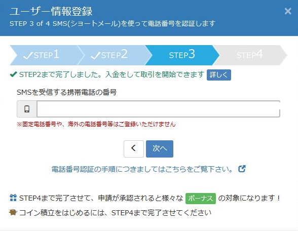 ステップ3で携帯電話の番号を入力し「次」をクリックするとZaifから6桁の認証コードがSMSで送られてくるのでその数字を入力してステップ4に進みます。