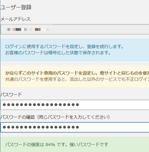URLをクリックすると本登録が始まり、メールアドレスの確認とパスワードの設定を行います。パスワードはなるべく長くしてパスワードの強度は80%以上を目安にしましょう。